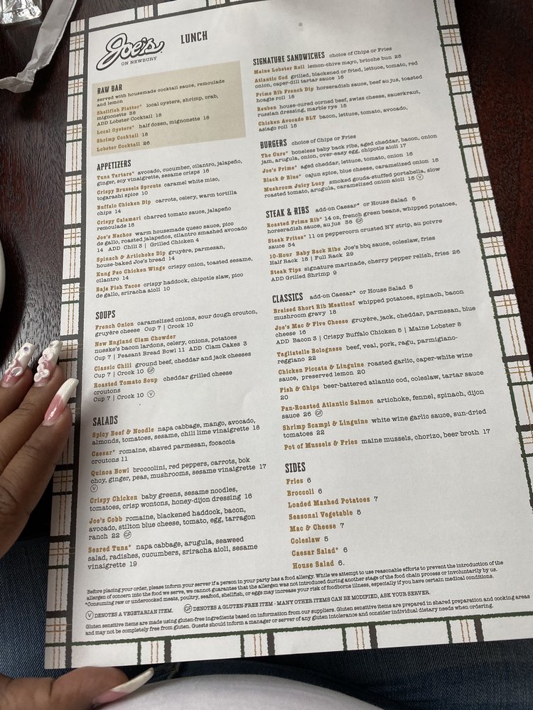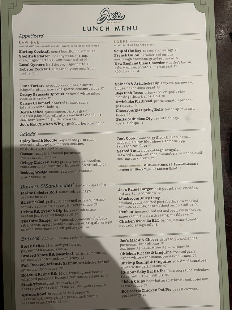 Joe's On Newbury is a popular spot on Newbury Street in Boston, offering a range of American cuisine, burgers, and cocktails. With a diverse menu including items like Joe's Nachos, Lobster Cocktail, and Spinach & Artichoke Dip, there is something for everyone. The restaurant offers vegan options, limited vegetarian choices, and is wheelchair accessible. Customers praise the delicious food, attentive service, and cozy atmosphere. The lobster roll and Reuben sandwich are standouts, and the brunch cocktails like the Espresso Martini and Classic Bloody Mary are worth trying. Joe's On Newbury is perfect for a casual lunch or dinner, and the outdoor seating and private dining options make it a versatile choice for any occasion. Whether you're looking for a quick bite or a leisurely meal, Joe's On Newbury has something for everyone to enjoy.